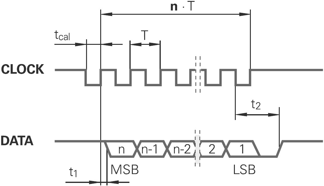 SSI協(xié)議說明: SSI為同步串聯(lián)信號,實際的兩對RS422,一對時鐘觸發(fā),一對數據發(fā)送。 如右圖所示,編碼器的絕對位置值由接收設備的時鐘信號觸發(fā),從格雷碼高位(MSB)開始,輸出與時鐘信號同步的串行信號。時鐘信號從接收設備發(fā)出,以編碼器的總位數輸出N個中斷的脈沖,當不傳送信號時,時鐘和數據位均是高位,在時鐘信號的第一個下降沿,當前值開始貯存,從時鐘信號上升沿開始,數據信號開始傳送,一個時鐘脈沖同步一位數據。 其中:t3為恢復信號,等待下次傳送;N=13;16;25;28。根據編碼器總位數。T=4—11us; t1=1—5.5us; t2≤1us; t3=11—15.5us (Clock-及Date-省略未畫)。 實際使用中,為保證信號的穩(wěn)定與較遠的傳輸距離,推薦參數如下: T=8us(125KHz); t1=4us; t2′(實際讀數延遲時間)=3~4us; t3=15us